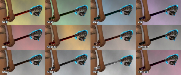 Man färbt den Stiel. Die Farbwiedergabe ist allerdings ziemlich seltsam: Rot, Orange und Gelb ergeben jeweils ein nur gering unterschiedliches strahlendes Rot. Blau ergibt Grün mit leichtem Blaustich, und Grün ergibt ein Gelb mit leichtem Grünstich. Lila färbt den Stab normal.