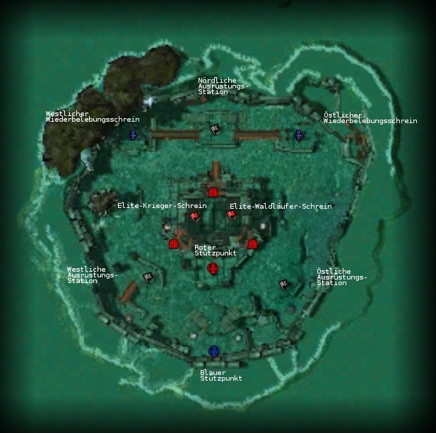 Je ein Team der Kurzick startet direkt an einem der Wiederbelebungsschreine sowie im blauen Stützpunkt, der einen Ausgang nach Norden mit Treppen und zwei Teleporter zu den südlichen Ausrüstungsstationen besitzt.